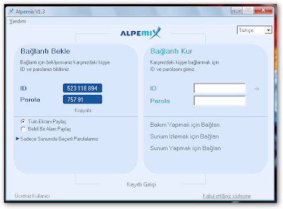 Alpemix uzaktan destek, sunum ve eğitim yazılımıdır. Alpemix sayesinde farklı yerlerdeki tanıdıklarınızla, aynı bilgisayarın başında yan yana oturuyor gibi çalışabilirsiniz. Kullanımı oldukça kolaydır ve kurulum gerektirmemektedir. Hemen bilgisayarınıza indirip kullanmaya başlayabilirsiniz.